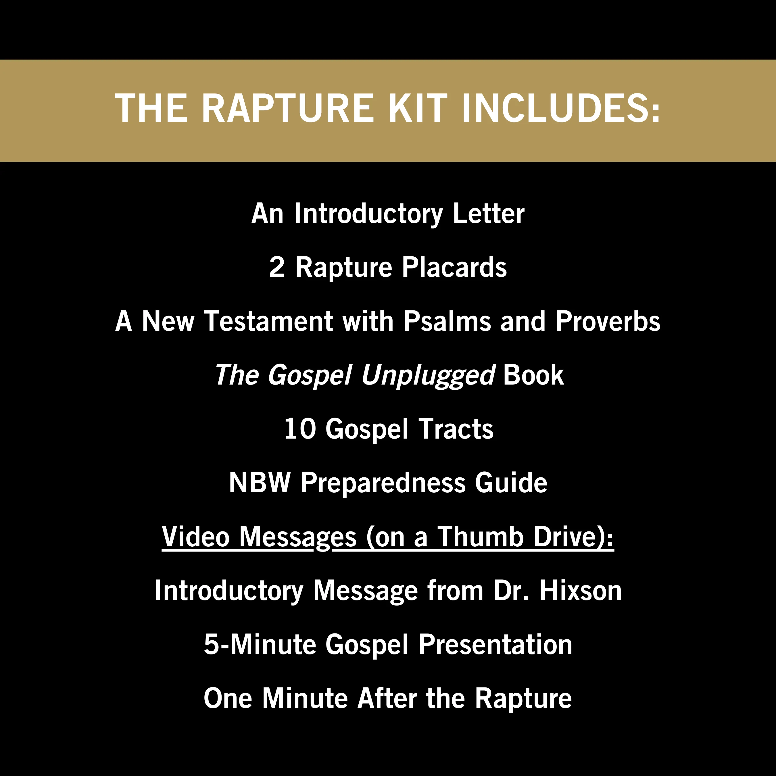 This Rapture Kit contains carefully selected materials for those left behind at the Rapture. It explains why millions of people disappeared, what comes next, and how they can be saved by faith alone in Christ alone.